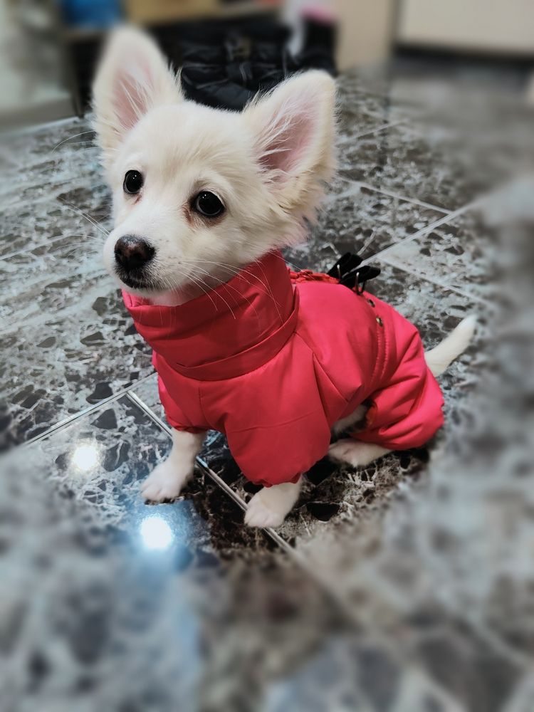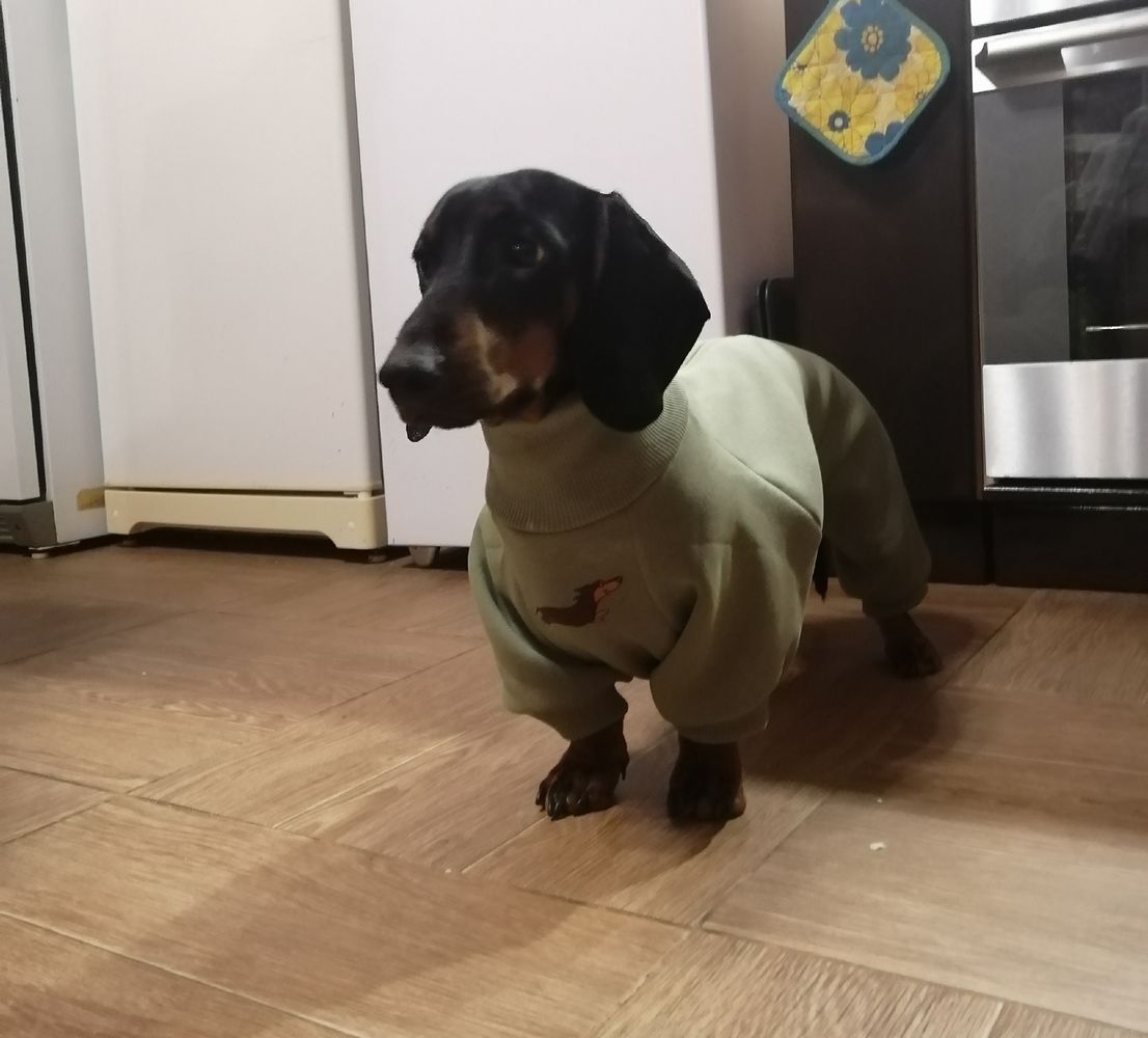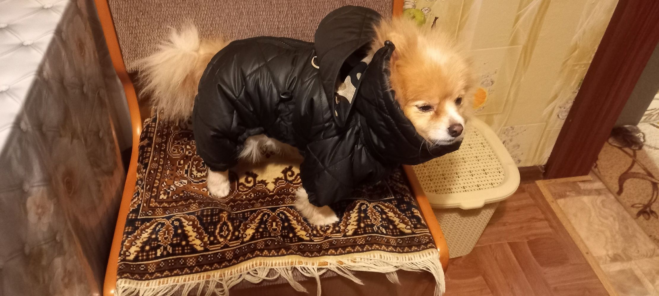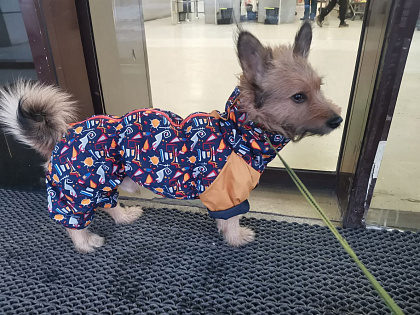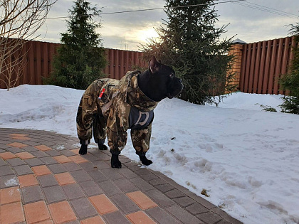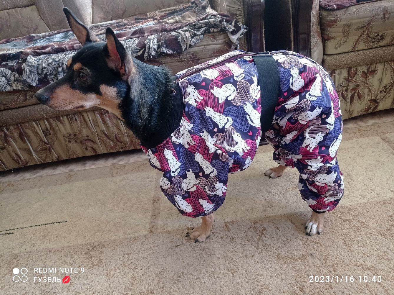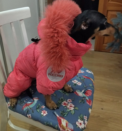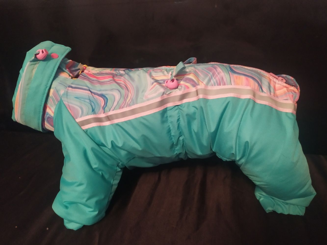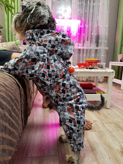 Insulated jumpsuit for a dog. There are cuffs along the sleeve hems. There is a stand collar with tightening; drawstring on the garment lower part. The garment model is fastened with a zipper. There is also a removable hood.